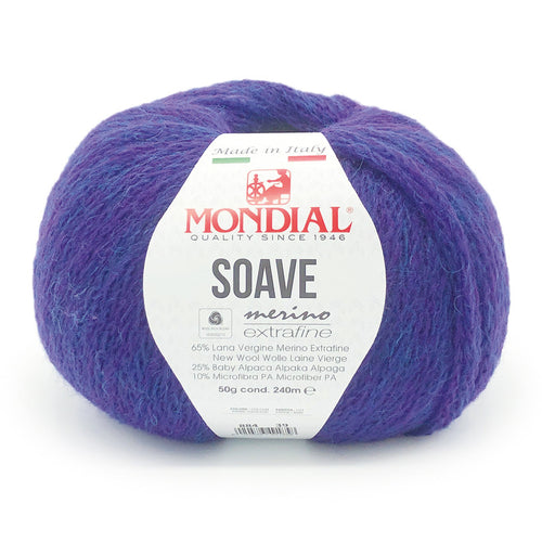 Soava fra Mondial er et ypperligt garn bestående af 65% merinould extrafine, 25% baby alpaka og 10% mikrofibre. Garnet er spundet så det laver en kædestruktur, der gør garnet meget let med en god volumen og holdbarhed. Garnet er utrolig smukt og kommer i flote farver med en delikat melering. Soave har en strikkefasthed på 20 masker på pind 4.0 mm og en løbelængde på 240 meter pr. 50 gram.
