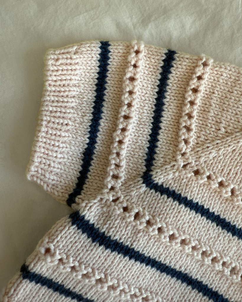 Ida Tee Junior strikkes oppefra og ned med et mønster af strukturstrik og striber. Først strikkes frem og tilbage på pinden for at danne halsudskæringen, og herefter samles arbejdet, således at resten af bærestykket strikkes rundt på rundpinden med raglanudtagninger. Langs halsåbningen samles der masker op og strikkes en halskant i rib.