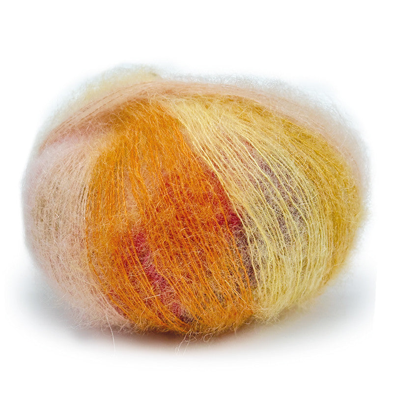 Kid Seta Print er en iøjnefaldende version af Mondials klassiske luksusgarn – Kid Seta. Garnet er kendt for sin ultrafine og bløde struktur med et let fluffy udtryk. Denne trykte variant kombinerer smukt både klare og afdæmpede nuancer i flerfarvede striber, der giver dine strikke- og hækleprojekter et unikt og levende udtryk.