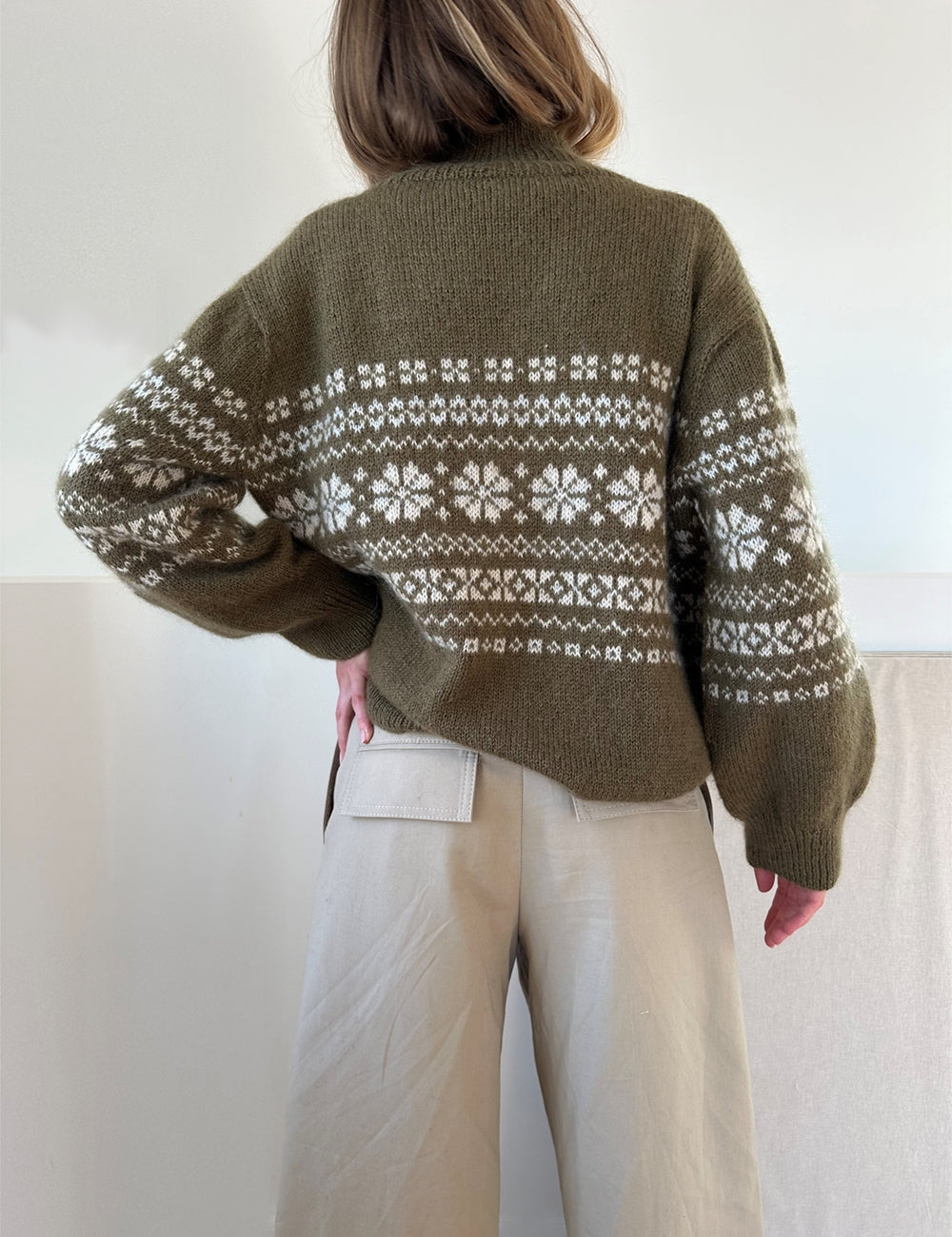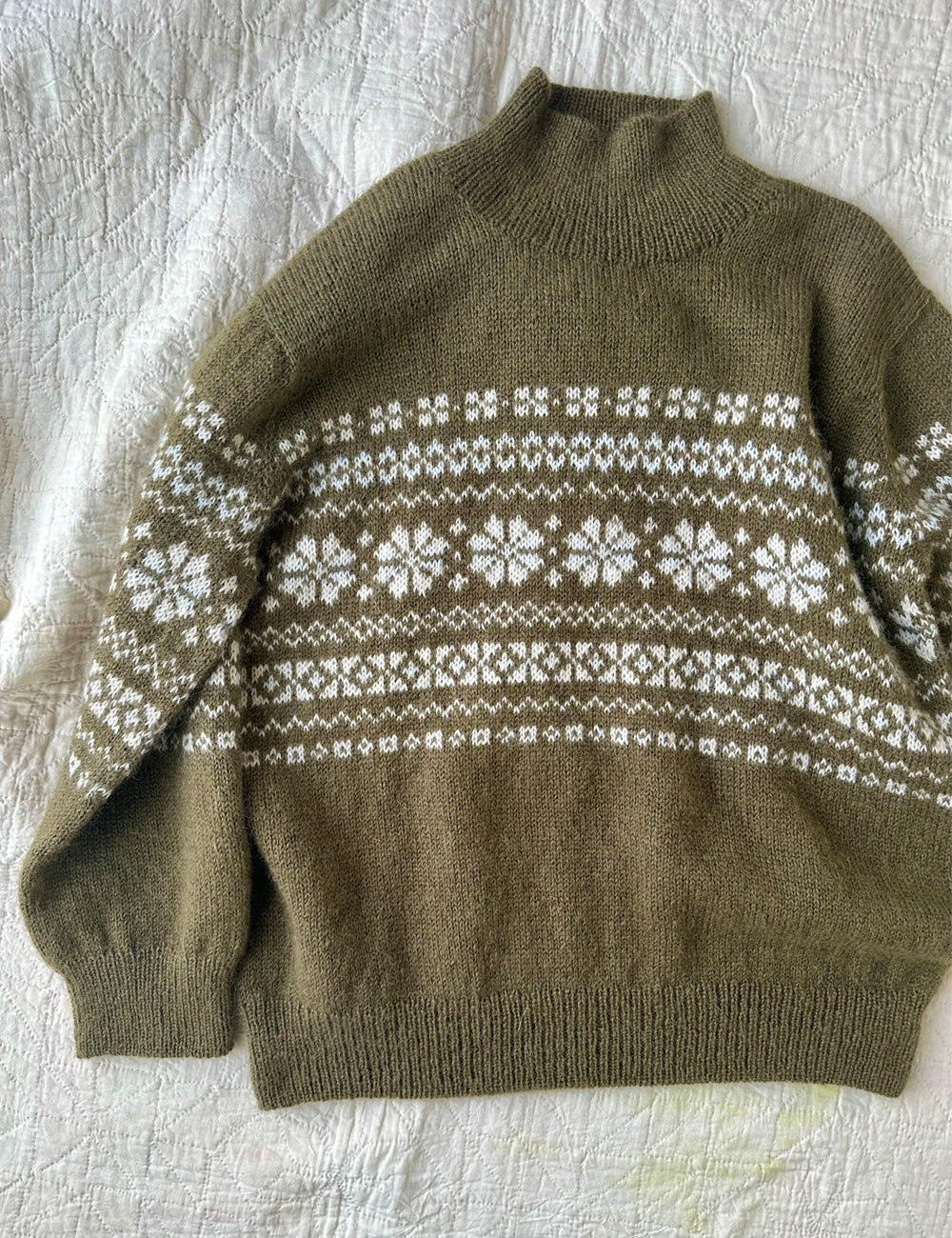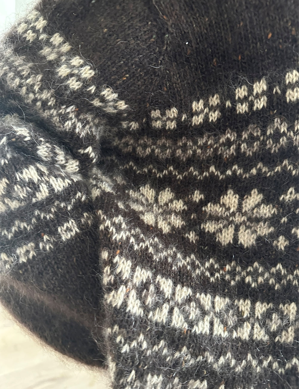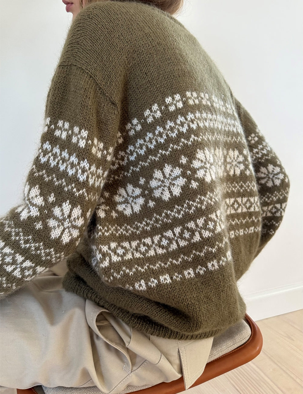 Harriet Sweater er rummelig, og den snedige konstruktion er en kombination af ærmekuppel og raglan, som betyder at al mønster kan strikkes rundt fra retsiden. Mønsteret på Harriet Sweater er tænkt til to lyse mønsterfarver og én mørk bundfarve. Eller omvendt!