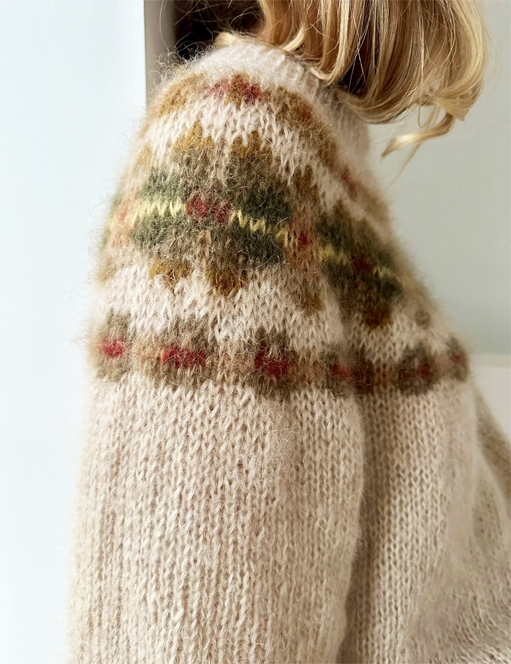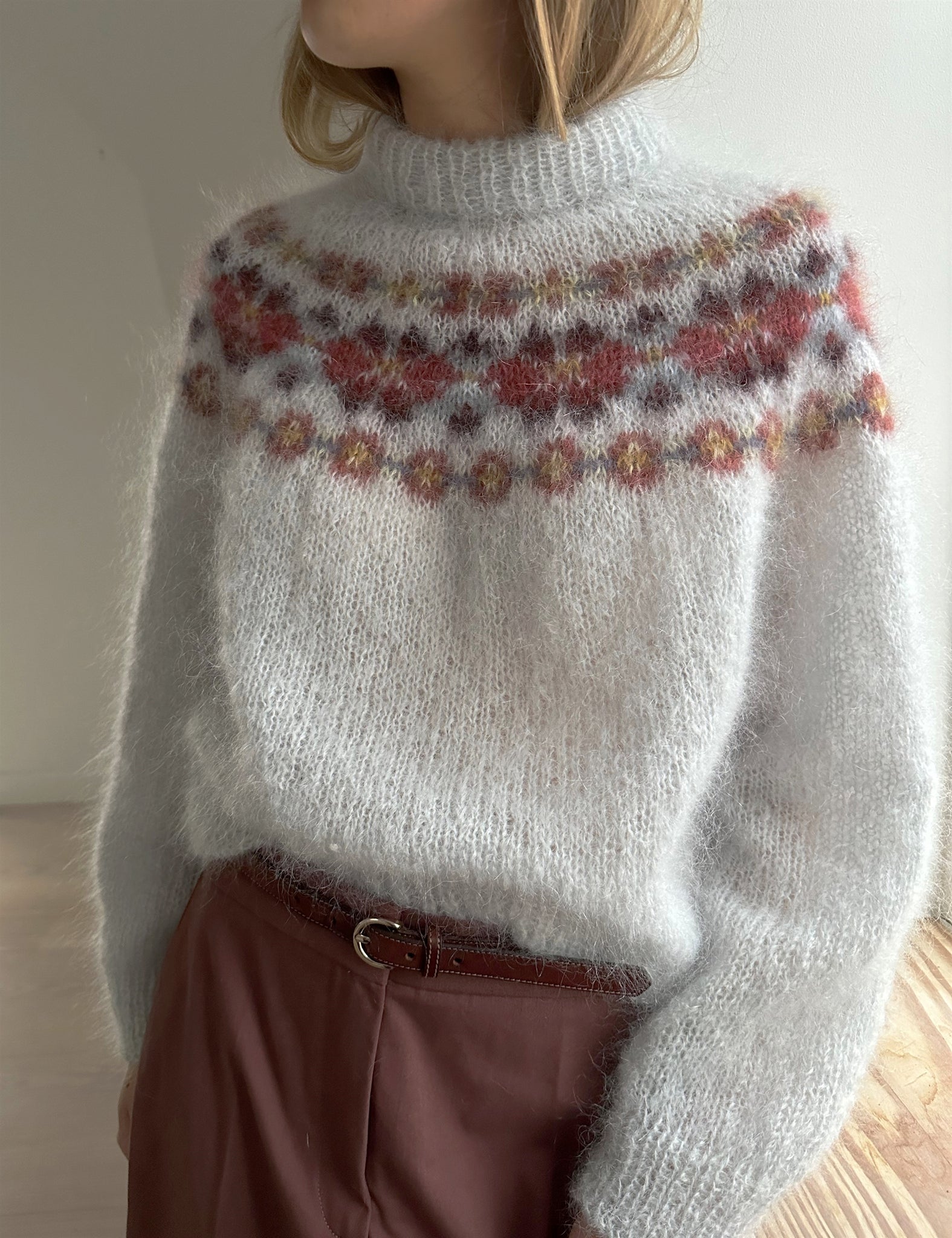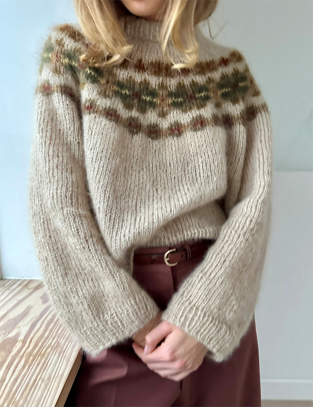 Margaret Sweater er en oplagt måde at få brugt sine små mohairrester på. Sweateren har fair isle mønster på det runde bærestykke, og i den type mønster skifter både bundfarve og mønsterfarve, men man strikker altid med højst to farver ad gangen. For at gøre det enkelt for dig, indeholder opskriften fem konkrete farveforslag.