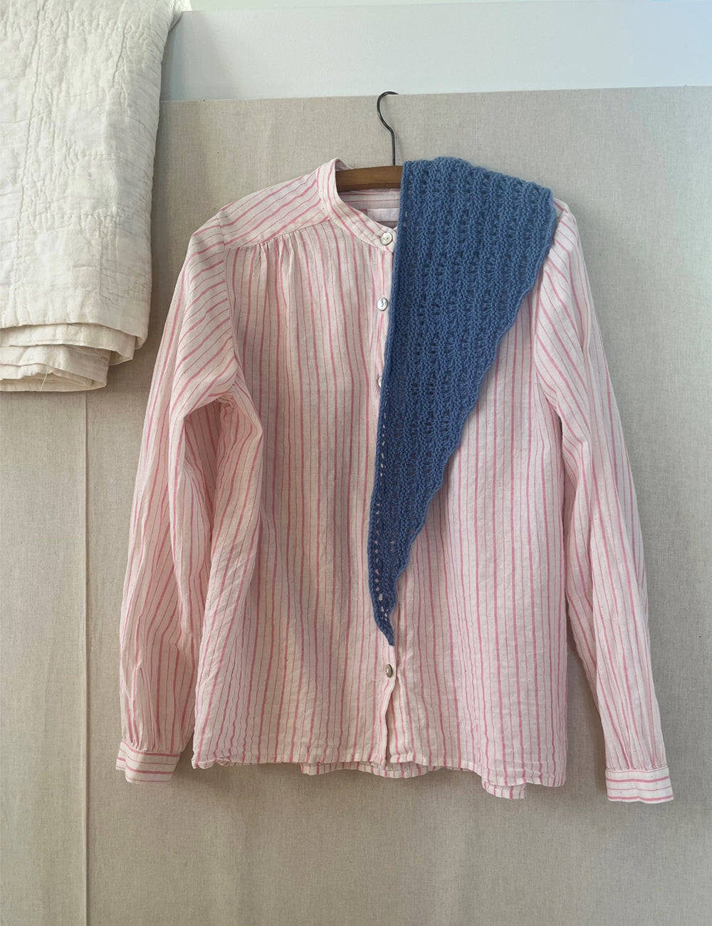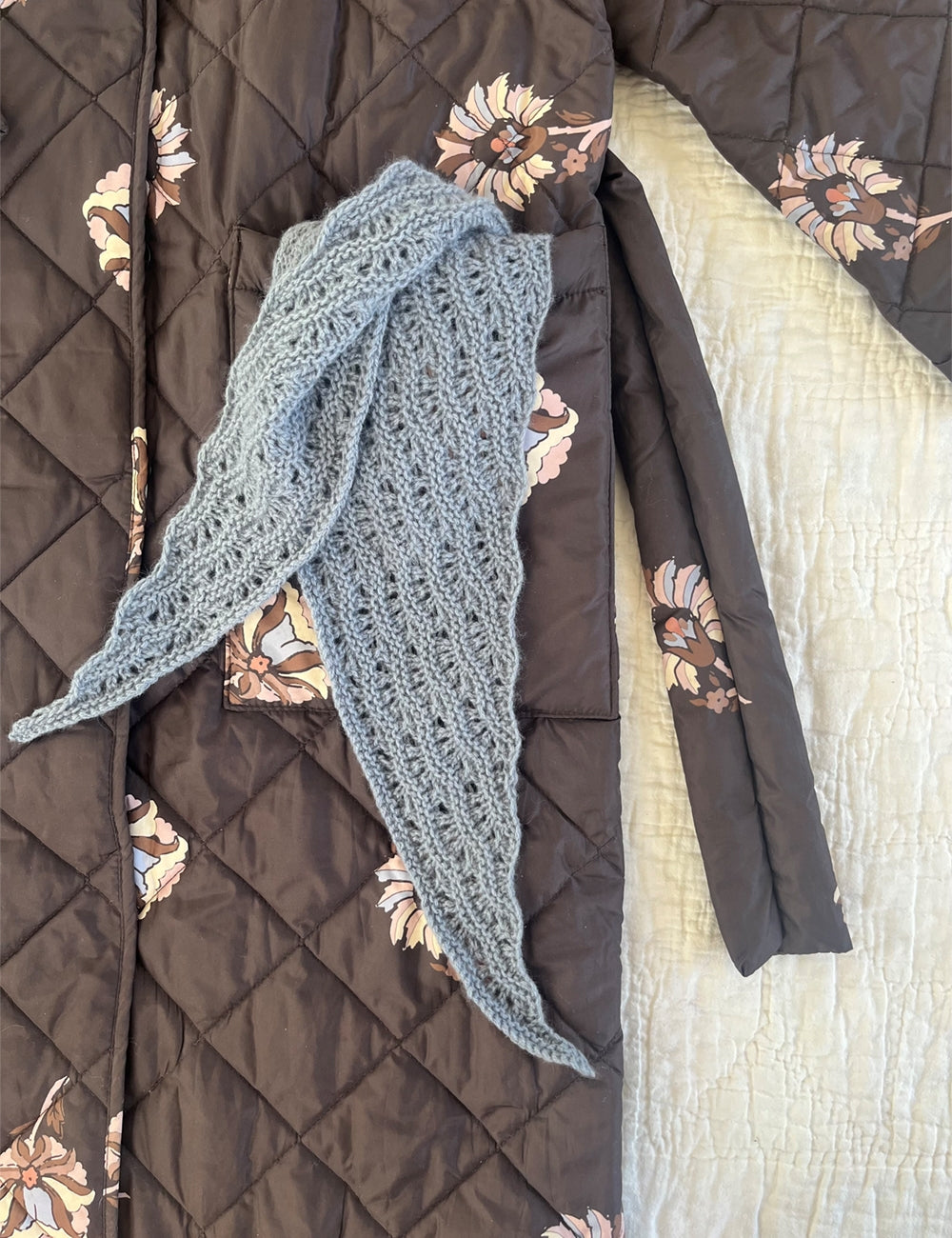 På billederne ses lille tørklæde i silver 509, louis 720 og hashi 716 samt stort tørklæde i dust 707.