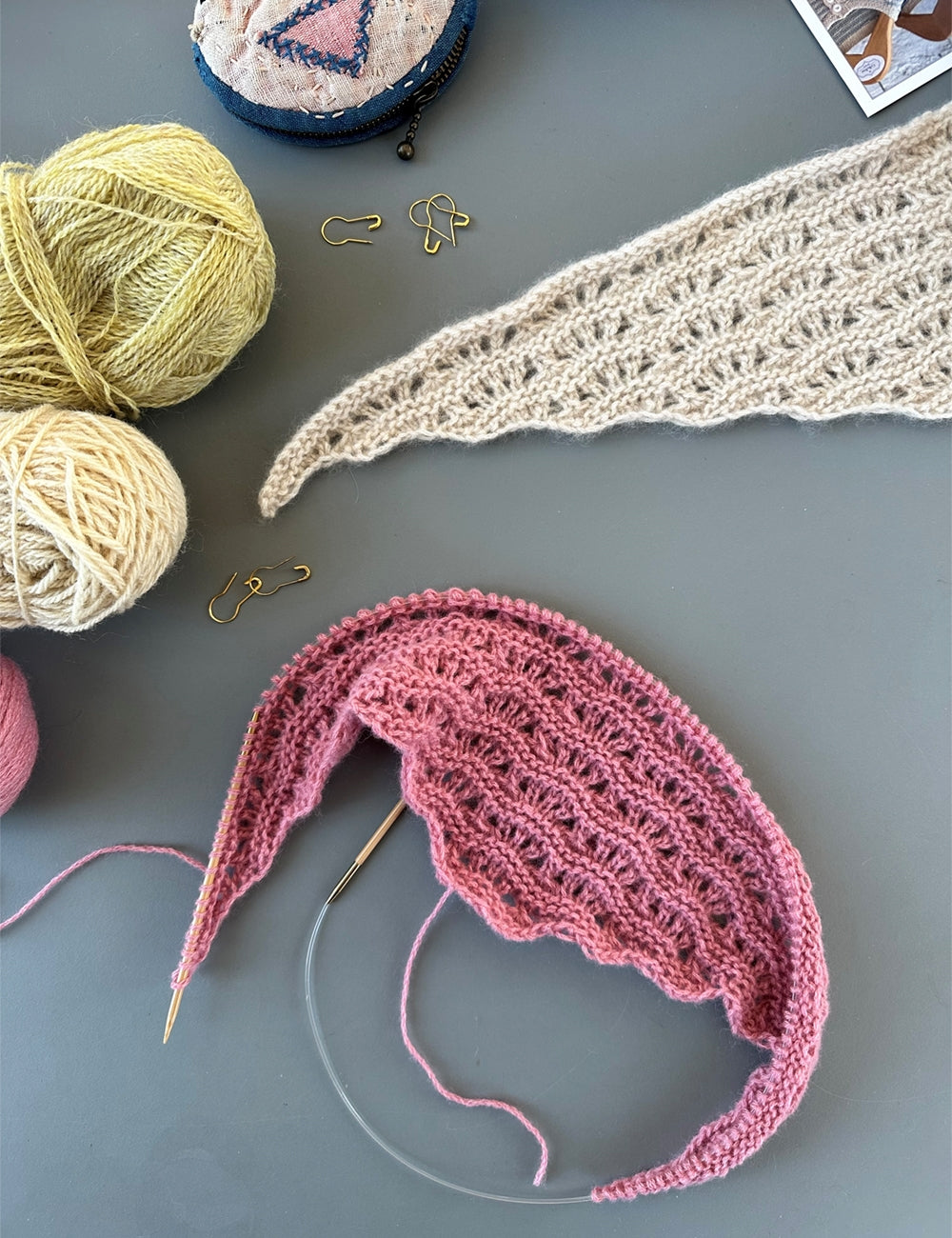 Man begynder i tørklædets spids. Derpå strikker man frem og tilbage på rundpinden med mønster efter diagrammet (og/eller teksten). Der tages automatisk ud i hver side, når man følger diagrammet (og/eller teksten). Dvs. der bliver automatisk flere og flere masker.