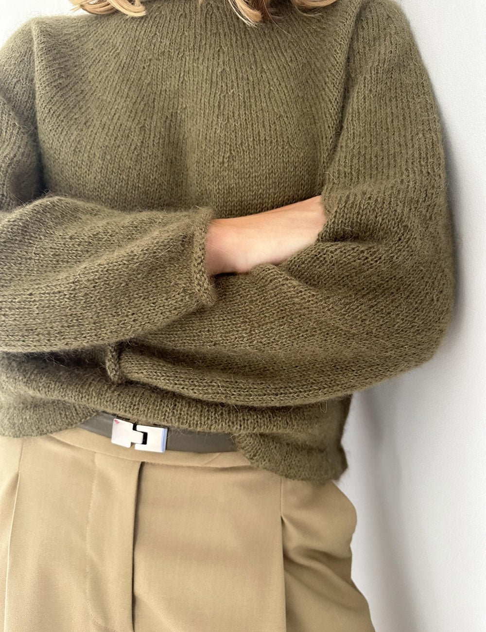 Find din personlige overvidde ved at måle dig om brystet (eller overkroppens største mål). Se derefter på målene først i opskriften (dette er blusens færdige mål). Bevægelsesrum (positive ease) er forskellen mellem dit personlige mål og blusens mål. Er din overvidde f.eks. 94 cm, vil en str. M give dig et bevægelsesrum på 15 cm (109 cm – 94 cm = 15 cm). *Længden er målt midt bag (ekskl. rullekanten).