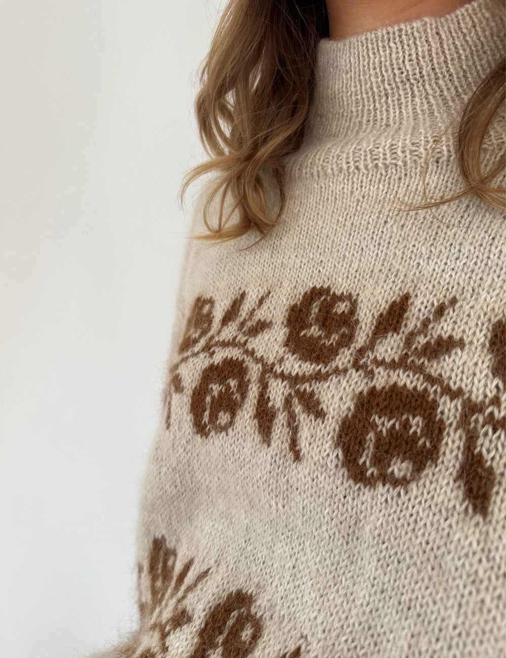 Rosie Sweater har to rosenborter på krop og ærmer, og den snedige konstruktion er en kombination af ærmekuppel og raglan, som betyder at al mønster kan strikkes rundt fra retsiden.