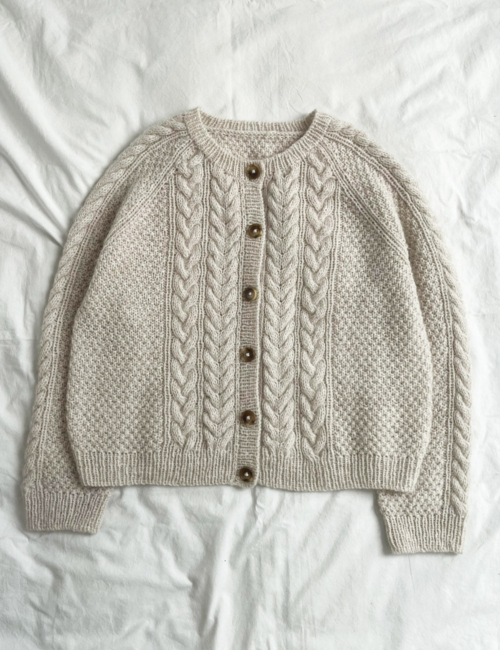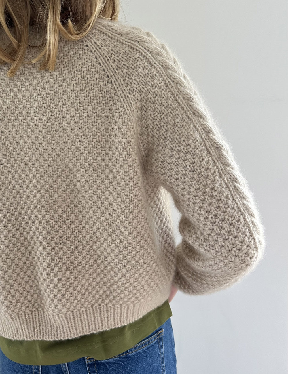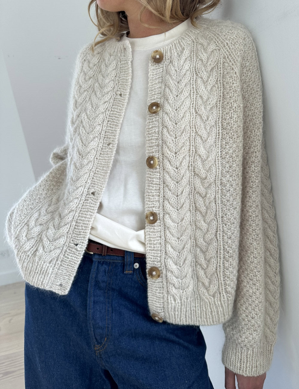 Siri cardigan er et overskueligt projekt med snoninger. De få, men velplacerede, snoninger er nemlig kombineret med et lille nemt mønster i dobbelt perlestrik, der bliver fint og fyldigt i både blowgarn og i en kombination af uld og mohair. Siri Cardigan har en snoning midt på hvert ærme og to snoninger på hvert forstykke. Ryggen er strikket udelukkende i dobbelt perlestrik.